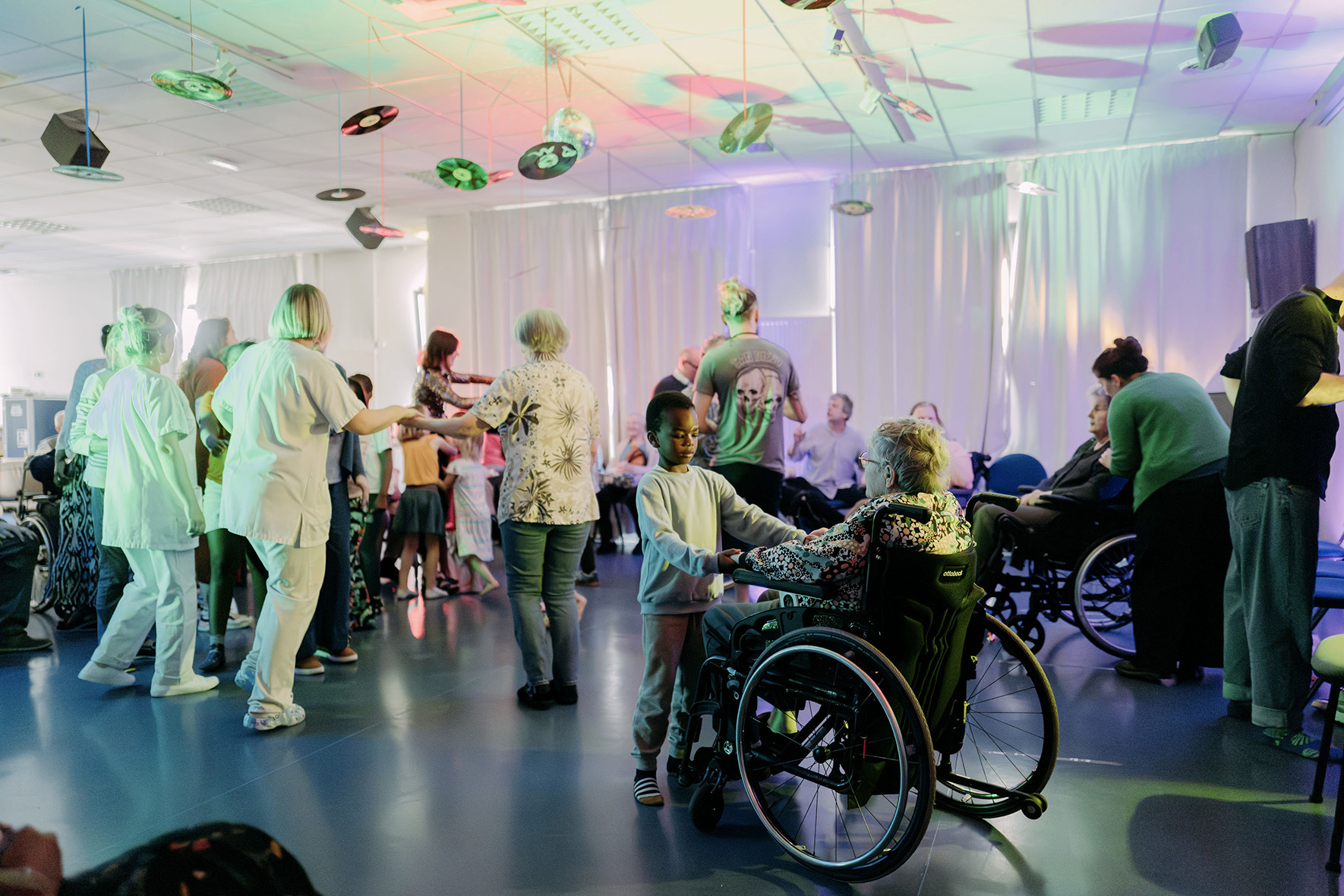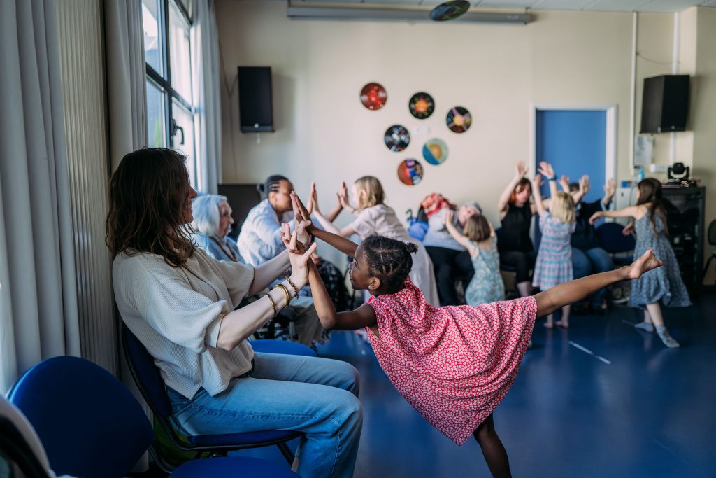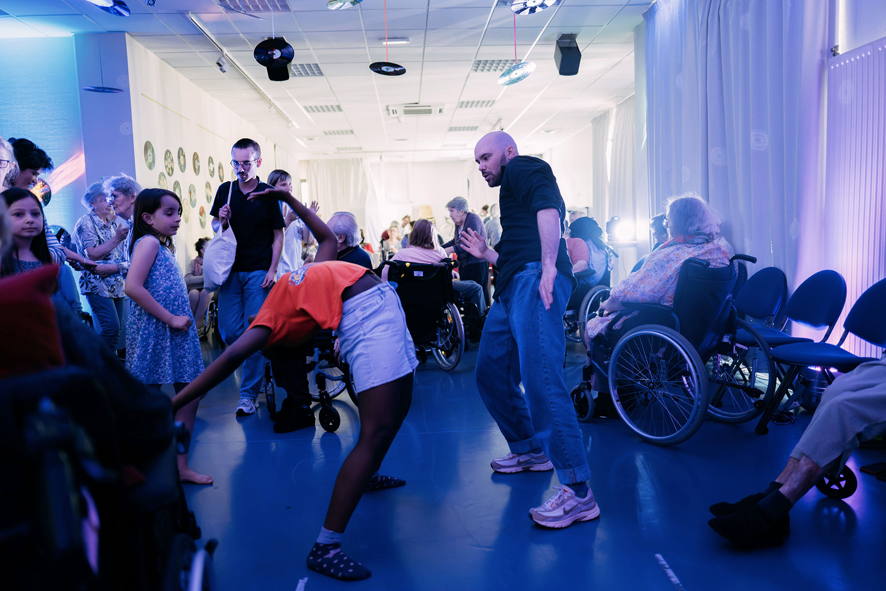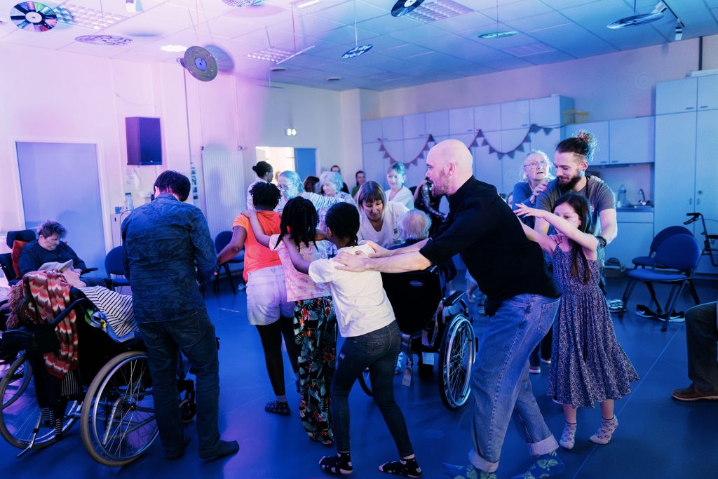 Depuis l’automne 2023, un projet artistique et intergénérationnel, piloté par le Théâtre National de Bretagne, a réuni des résidents et résidentes de l’EHPAD Pavillon Damien Delamaire, de l’USLD (Unité de Soins Longue Durée) La Tauvrais du CHU de Rennes, et des enfants du centre de loisirs de l’Ille à Rennes. Mené par le danseur Yann Hervé du Collectif Imprévu.e.s, accompagné par la musicienne Clémence Prayez et la comédienne Adèle Csech, ce projet a permis à chacun de se rencontrer autrement, à travers le mouvement, le jeu et la création. Les artistes ont su adapter leur approche pour permettre à chacun de s’exprimer à son rythme. Entre échauffements, danse assise, jeux de miroir, les ateliers étaient adaptés à tous les niveaux et aux capacités de chacun et chacune. Au fil d’ateliers chorégraphiques, de moments partagés au théâtre et de fêtes collectives, enfants et aînés ont tissé des liens profonds, sincères et joyeux. La restitution finale sous forme de « bal boum » a célébré cette belle aventure humaine, riche en émotions, en découvertes et en sourires.